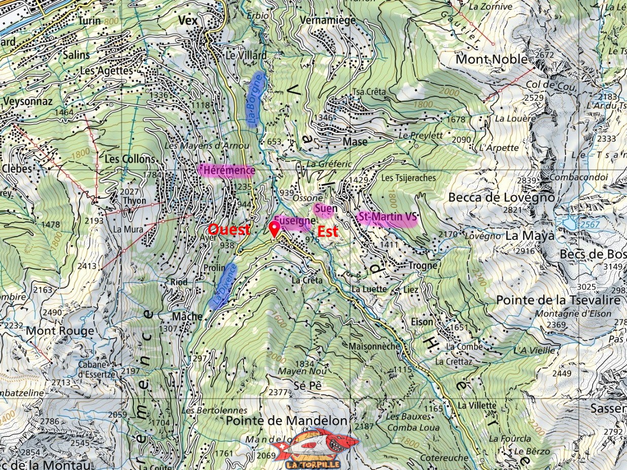 L’emplacement des Pyramides, à côté du village d’Euseigne. Les rivières de la Borgne et de la Dixence. Les village d’Hérémence, de Suen et de St-Martin.