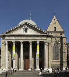 La cathédrale de Genève avec son portail néoclassique. L’entrée du site archéologique se trouve sur la droite de la photo.