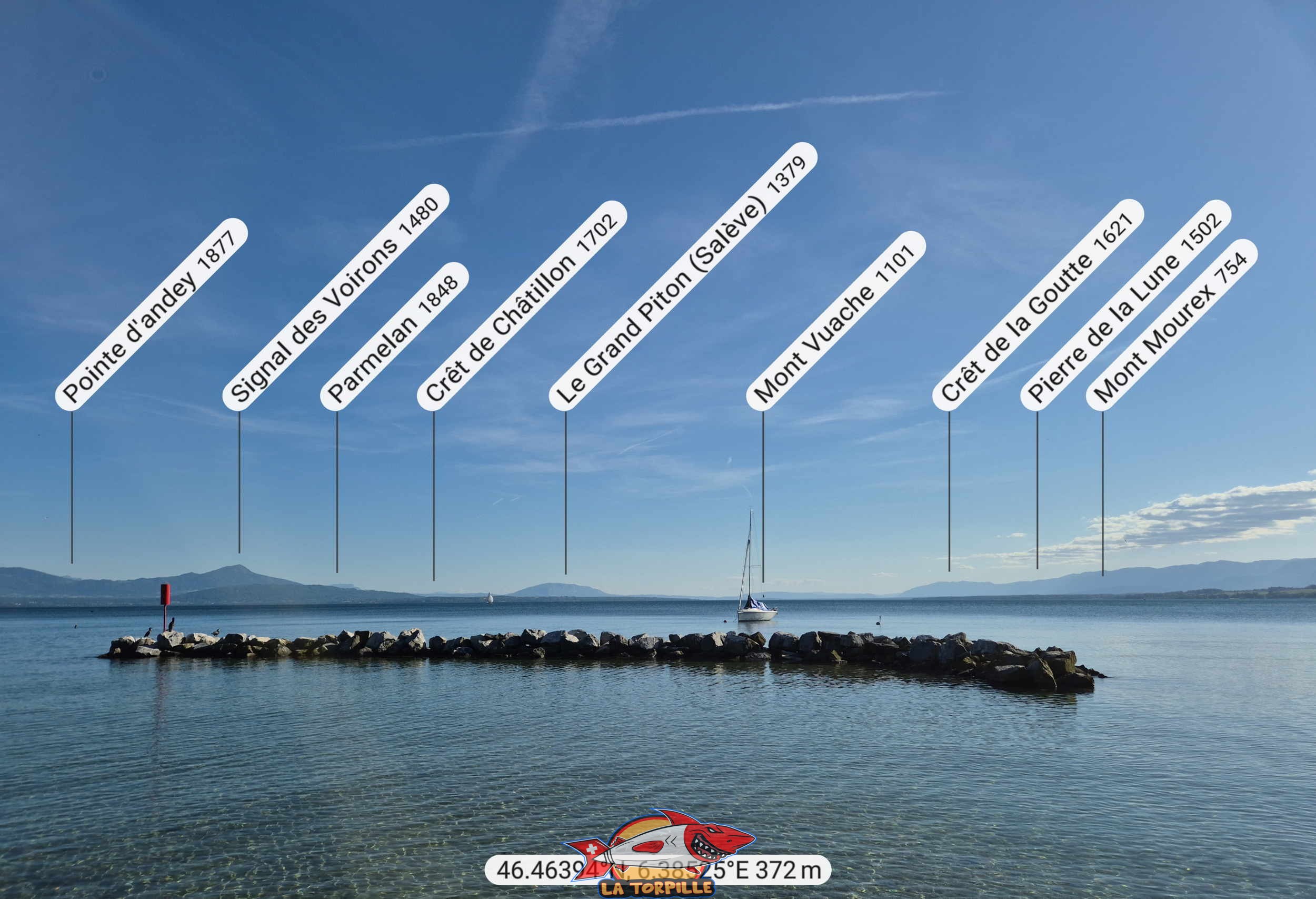 La vue direction nord-ouest. Le zoom sur la ville de Genève et sa rade avec le Jet d’Eau.