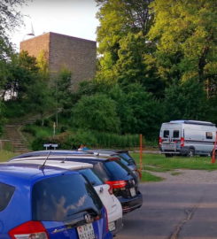 La tour de Gourze avec le parking en arrière-plan.