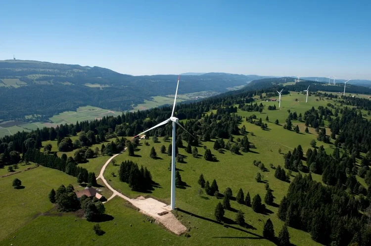 Le parc d’éoliennes du Mont Soleil avec le vallon de St-Imier. Au fond, à gauche de l’image, l’antenne du Chasseral. Photo : espacedecouverte.ch