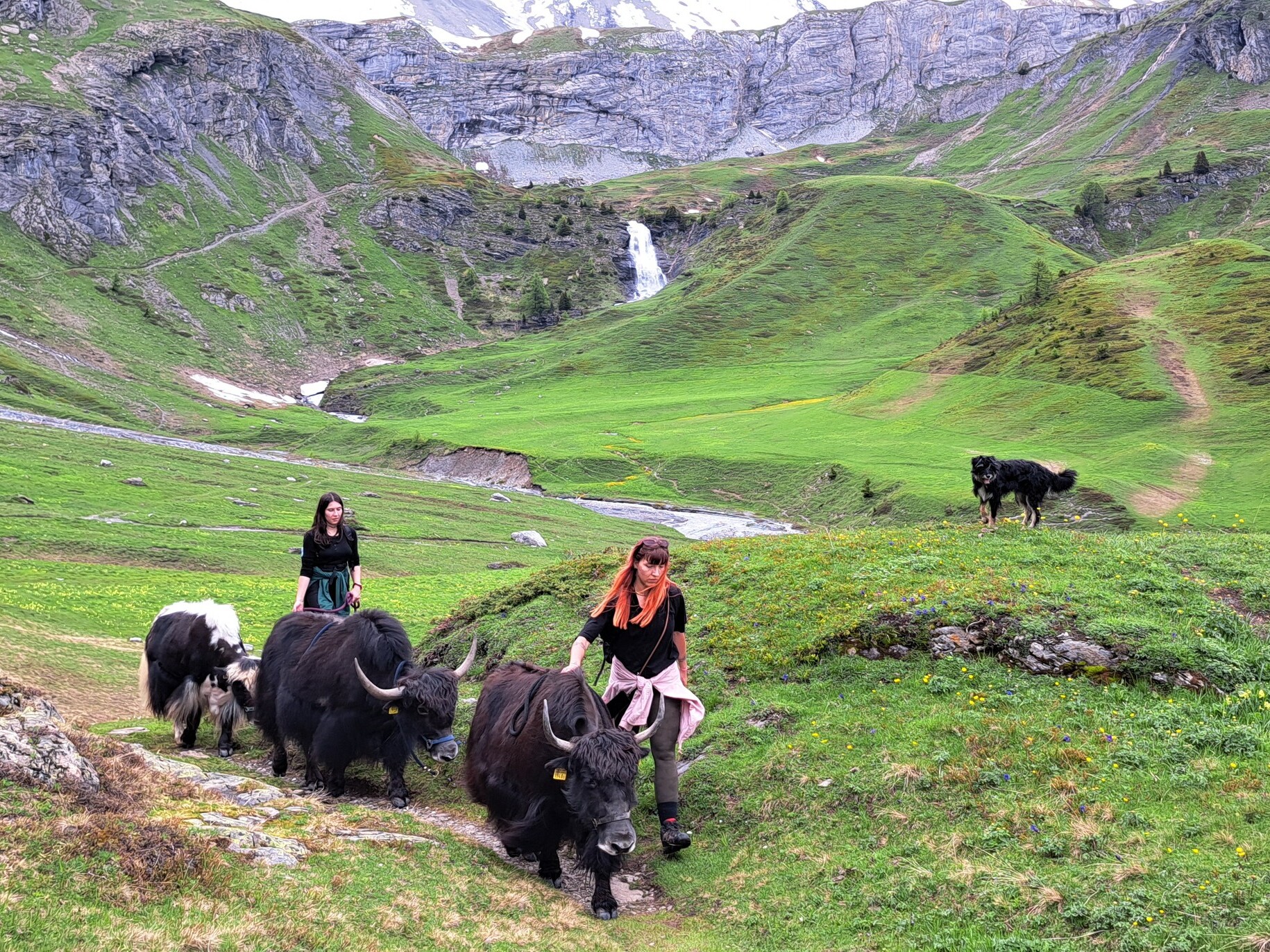 Les yaks avec le cascade de la Tièche en arrière-plan. Photo : Facebook Yak’à’Oser