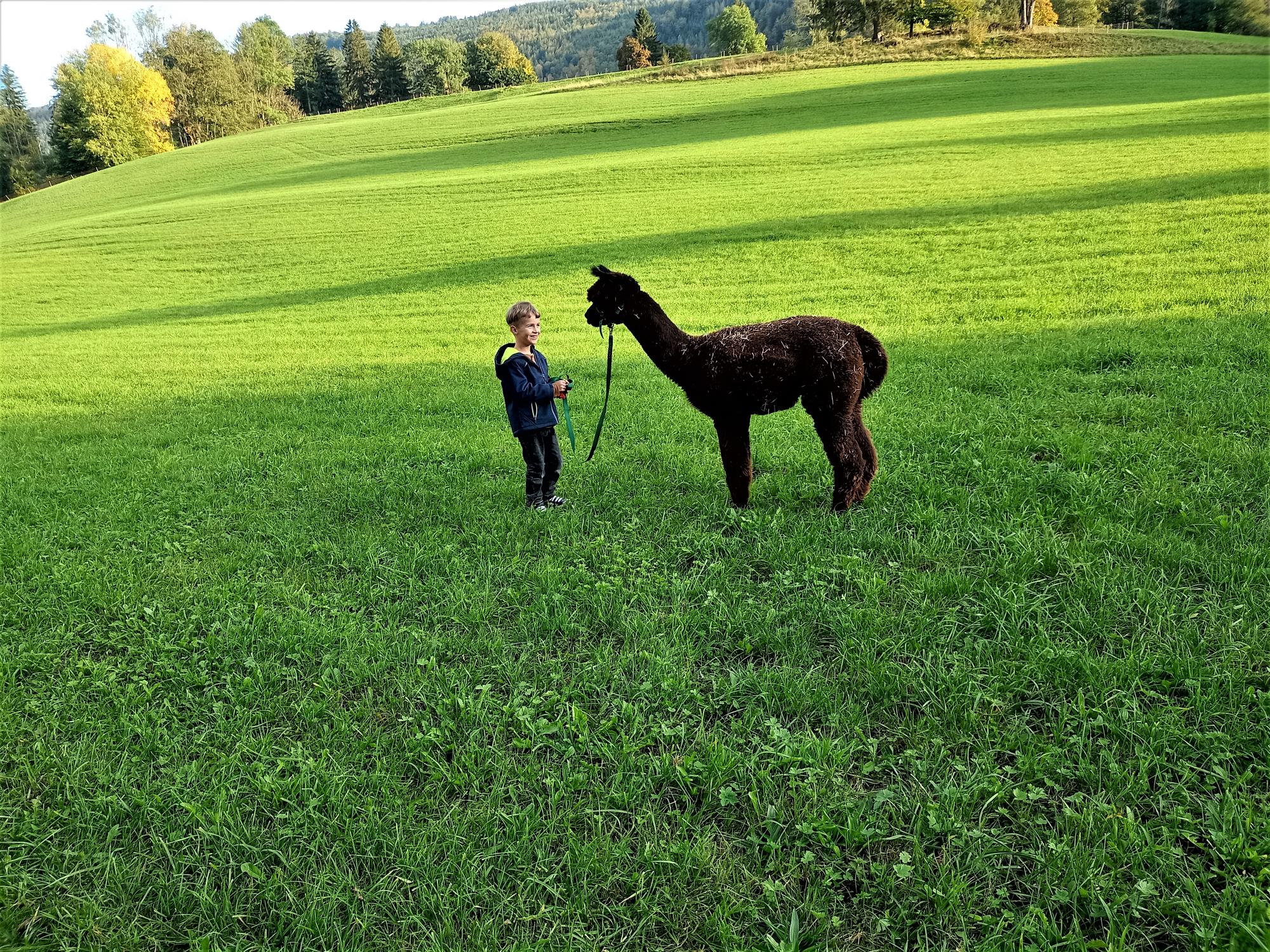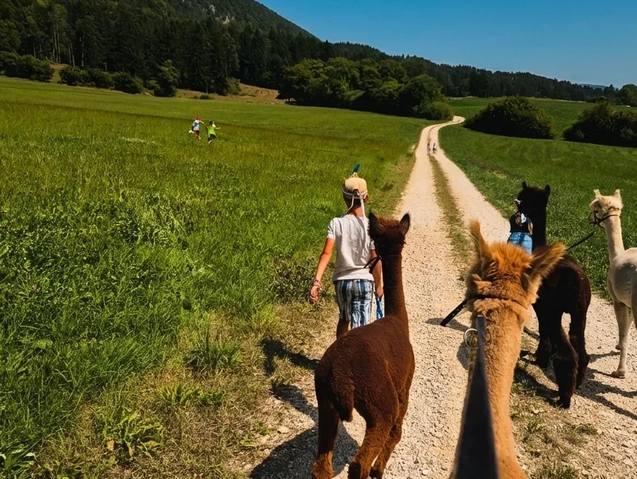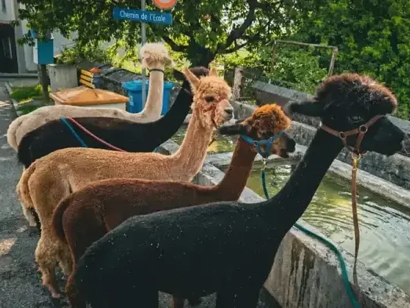 Une balade avec les alpagas (1h30) : CHF 70.– par groupe (env. 2 personnes / 2 alpagas).