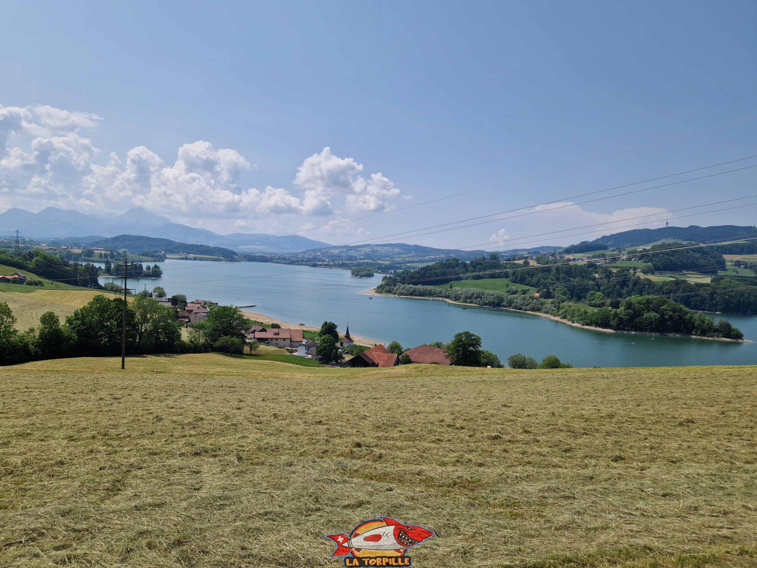 Le lac de la Gruyère au-dessus de Pont-la-Ville. En arrière-plan, légèrement à gauche, le Moléson.